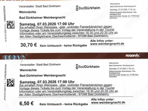 Hallo! Verkaufe 1x Weinpass und 1x Flanierbändchen für die Bad Dürkheimer Weinbergnacht am Samstag (7.März 2026). Das Event ist ausverkauft. Verkauft wird nur die Kombi aus Pass und Flanierbändchen. Nur für Selbstabholer in 67256. Beides zum Originalpreis: Weinpass: 30,70 + Flanierbändchen: 6,50 ...