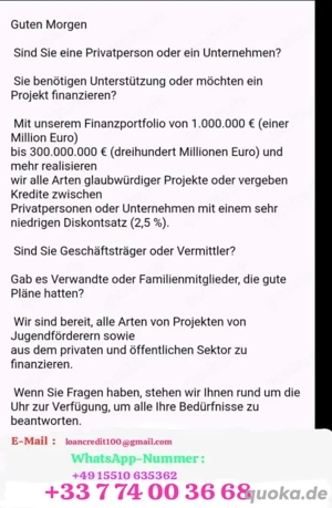 Willkommen bei der Europäischen Zentralbank. Wir verfügen über ausreichende Mittel, um Privatkredite von 2.000 bis 500.000 an jeden seriösen Kreditnehmer mit einem nachweislichen Finanzierungsbedarf zu vergeben. Der Zinssatz beträgt 3 %. Ich bemühe mich, die Anfragen meiner Kunden schnellstmöglich ...