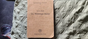 Die Nürnberger Gesetze über das Reichsbürgerrecht und den Schutz des deutschen... (8 Broschiert) 107 S. Original-Verlagseinband sehr gut erhalten. Schnitt und Seitenwerk alters- papierbedingt gleichmäßig mäßig nachgedunkelt. Frakturschrift. Buchspiegel mit kleinen bräunlichen Flecken. Seitenwerk punktuell ...