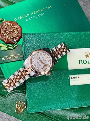 Rolex Datejust Damenuhr 179171 Meteorit-Diamant 26 mm Automatikwerk mit Datumsanzeige Seltenes Meteorit-Zifferblatt mit 10 Diamant-Stundenmarkierungen Geriffelte Lünette aus 18 Karat massivem Roségold Jubilee-Armband aus 18 Karat massivem Roségold mit Stahlelementen Neuwertiger Zustand Komplettes Set ...