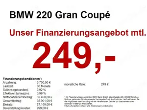 BMW 220 Gran Coupé M Sportpaket Navi. RFK. Komfzugan. BMW 220 Gran Coupé M Sportpaket Navi. RFK. KomfzuganAUSRÜSTUNG: Tagfahrlicht,Klimaanlage,Radio,Lederlenkrad,Schlüssellose Zentralverriegelung,ESP,Spurhalteassistent,Kopfairbag,Elektrische Seitenspiegel,Apple CarPlay,ABS,Sportsitze,Tempomat,Berganfahrassistent,Volldigitales ...