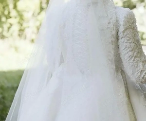 Wunderschönes Brautkleid mit Spitze, Langarm, langer Schleppe & passendem Schleier. Einmal getragen, sehr guter Zustand. Größe dank Schnürung verstellbar. Details zum Kleid: Schnitt: A-Linie Prinzessinnenstil Farbe: creme Off-White Oberteil mit feiner Spitze und dezenten Perlenstickereien Langarm ...