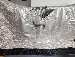 2,8x2,4 m große Tagesdecke, silberfarben mit umlaufendem ca. 22 cm breiten schwarzem Rand und asiatischem Drachenmotiv in der Mitte. Wenig genutzt.