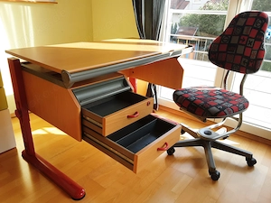 Ich muss raus.... wir verkaufen einen hochwertigen, mitwachsenden und verstellbaren Kinderschreibtisch der Marke Moll. Maße ca. 115 x 60cm sowie einen anpassbaren Schreibtischstuhl (rollbar) der Marke Moll mit verstellbarer Lendenstütze. Tisch ist höhenverstellbar und die Tischplatte kann schräg gestellt ...