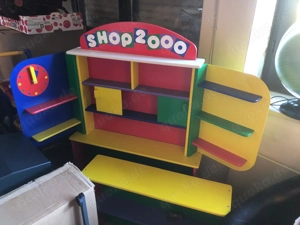 Kaufladen aus Holz mit Kasse, und Kunststoff-Lebensmitteln