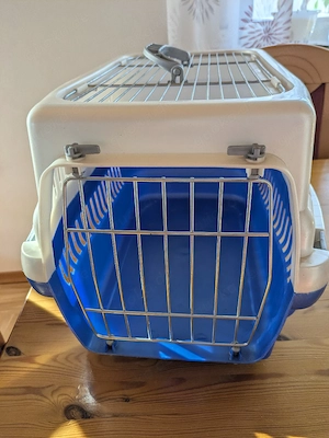Katzen Transport Box mit Tragegriff. Deckel und Unterteil sind mit Klipse befestigt zum einfacheren entfernen. Außenmaße ca. 50x30cm, Innenmaße ca. 40x20cm. Gitter vorne und oben abnehmbar.
