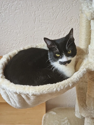 Hübscher lackschwarzer Kater, kastriert u geimpft, 1 Jahr alt, sucht ruhiges Zuhause. Er ist sehr lieb und verschmust, eher ein ruhiger Vertreter. Er kennt andere Katzen, keine Kinder. Wird nur in Katzengesellschaft und nicht in den Freigang gegeben.