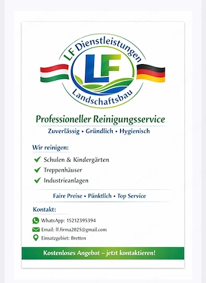 Sehr geehrte Damen und Herren, hiermit möchte ich Ihnen mein neu gegründetes Unternehmen LF Dienstleistungen + Landschaftsbau vorstellen, das umfassende Reinigungsdienstleistungen in Bretten und Umgebung anbietet. Unser Ziel ist es, sowohl Privatpersonen als auch Unternehmen zuverlässige, gründliche ...