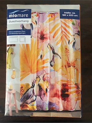 Es handelt sich um einen nagelneuen originalverpackten Textil-Duschvorhang. Außer den 12 transparenten Befestigungsringen lege ich noch 2 x 12 weiße Befestigungsringe dazu. Wir sind ein tierfreier Nichtraucherhaushalt Privatverkauf, keine Rücknahme und Garantie