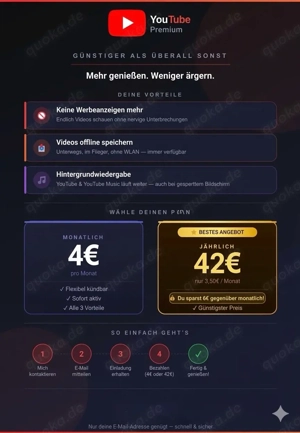 Hallo zusammen, ich biete YouTube Premium über mein Familienabo an. Ihr nutzt Premium ganz normal auf eurem eigenen Account. Vorteile: Keine Werbung YouTube Music inklusive Videos offline speichern Hintergrundwiedergabe Preis: 4 pro Monat oder 42 pro Jahr So funktioniert ...