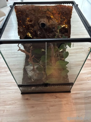 Gebrauchtes Glas-Terrarium 45 45 60 cm, komplett eingerichtet inkl. Beleuchtung, so wie auf den Bildern. Mit Rückwand und Bodengrund. Mit Ablass im Boden.