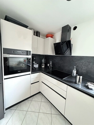 Zum Verkauf steht eine hochwertige, moderne Einbauküche in edlem Hochglanz-Creme Weiß mit eleganter dunkelgrauer anthrazitfarbener Arbeitsplatte und Rückwand in Steinoptik. Die Küche überzeugt durch ihr zeitloses Design mit klaren Linien und integrierter LED-Beleuchtung an den Griffleisten. Die Küche ...