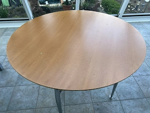 Verkaufe runden Eßtisch,120 cm Durchmesser. Höhe bis Tischoberkante: 75 cm. Material Tischplatte: Holz (Buche ??). Vier Füße aus Metall, verchromt; abschraubbar (Bild 4). Zustand gut; auf der Tischplatte kleine grüne Verklebung (Bild 2) Alter des Tisches ca. 5 Jahre Nur Selbstabholung
