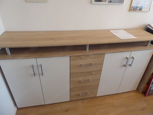 Wir verkaufen unser schönes Sideboard weil wir unser Büro verkleinern möchten. Der Zustand ist perfekt. Die schränke haben je ein Fachboden und in der Mitte sind 3 Schubladen. Länge 1,80 m, Breite 0,40 m, Höhe 0,90 m. Die Oberste Platte kann man bei Bedarf abschrauben, dann ist die Höhe statt 90 nur ...