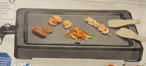 Teppan-Yaki-Grill für fettfreies Grillen und Braten, Aku-Grillplatte 47 x 25 cm mit Antihaftbeschichtung, Auslaufrinne und Auffangschale, 2000 Watt, incl. 6 Holzspateln, einmal im Sommerurlaub (Wohnmobil) benutzt.