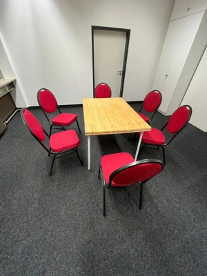 Es sind sechs neuwertige Stühle, mit sehr gut, fest gepolsterten, roten Sitzflächen und Lehnen in schwarzem Metallrahmen für 25.- Euro pro Stuhl abzugeben. Die Stühle können nach Absprache in der Trimburgstr. 2 in 81249 München abgeholt werden.
