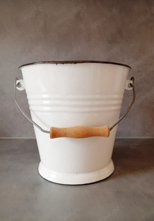 Eimer aus emailliertem Stahlblech, weiß, 5 l, Holzgriff. Für Dekozwecke, Bepflanzung. H x B = 22 x 26,5 cm. Dm. oben unten 24 17,5 cm.