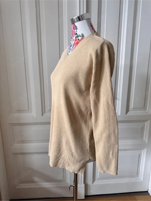 Dünner beigefarbener Strickpullover von Hallhuber Knitwear, vintage. Die Schneiderpuppe hat 36. Die Größe im Pulli ist mit M angegeben. Der Stoff ist etwas steifer. Vorne unten ist ein kleines Loch, welches im Gesamtbild aber kaum auffällt (siehe Bilder). Waschbar bei bis zu 30 Grad (Handwäsche empfohlen). ...