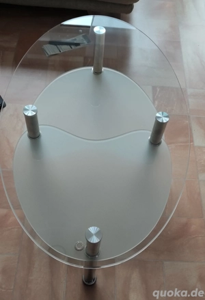 Glastisch oval, als Wohnzimmer- oder Beistelltisch. Maße BxHxT 90x41x55 cm Ablagen in Milchglas. Die Beine sind aus Edelstahl.