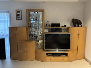 Extravagante Wohnwand aus einzelnen Elementen, verschieden kombinierbar (Vitrine beleuchtet). Dazu ein Sideboard mit beleuchteter Vitrine und eine einzelne, hohe, beleuchtete Vitrine. Das Ganze aus Massivholz furniert. Alle Elemente sind im Vorderbereich abgerundet. Zeitloses Design. Die Wohnwand hat ...