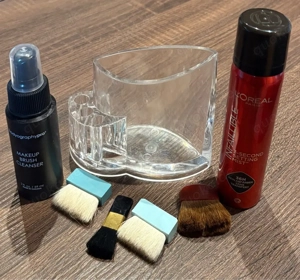 Aufbewahrung für Pinsel, drei Halterungen vorn und großes Fach hinten. Inklusive vier kleiner Taschenpinsel, einem Pinselreiniger und einem Fixierspray.