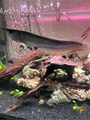 Verkaufe meinen Silberarowana er ist ca 30cm groß. Er frisst alles was er bekommt von Frost bis Lebendfutter.