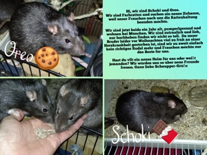 Hi, wir sind Schoki und Oreo, zwei Farbratten-Böckchen (1Jahr alt) und unkastriert. Wir suchen ein neues Zuhause weil unser Frauchen nach uns die Rattenhaltung beenden möchte. Wir sind jetzt beide ein Jahr alt und pumperlgesund und wohnen bei München. Wir sind zutraulich und lieb, nur hochheben finden ...