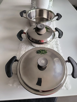 Verkaufe gut erhaltenes 3-teiliges AMC Edelstahl-Kochgeschirr-Set (2 Töpfe mit Deckel + 1 Stieltopf). Hochwertige Qualität, schwarze Griffe, Deckel mit AMC-Prägung. Sehr guter Zustand nur Abholung