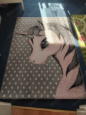 Verkaufe einen schönen Kinderteppich mit bezauberndem Einhorn-Motiv. Das rosa Einhorn ist auf grauem Hintergrund mit weißen Punkten dargestellt und bringt märchenhafte Stimmung ins Kinderzimmer. Maße: 173 x 120 cm Einhorn-Design in Rosa und Grau Grauer Hintergrund mit weißen Punkten Weicher ...
