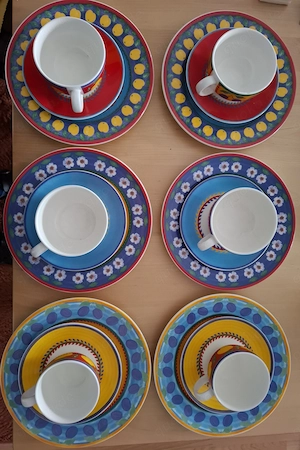VISTA ALEGRE "Gute Laune Garten Geschirr" Portugal 4 x Tassen a 9cm 2 x Tassen a 8cm 6 x Unterteller 6 x Kuchenteller 1 x Milchkänchen 1 x Kaffeekanne Sehr guter Zustand, nicht benutzt. Allerdings gibt es eine Abplatzung bei einer kleinen Tasse. Versand ohne Haftung durch Verkäufer für 10,90 Euro