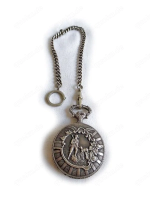 Schöne Taschenuhr (Savonette) von dem schweizer Hersteller "Cortebert" mit Kette. Die Taschenuhr befindet sich noch in einem top Zustand. Voll funktionsfähig. Eigenschaften: - Nickelgehäuse mit Jagd-Motiv; - Weißes Zifferblatt mit Muster; - Kleine Sekunde auf der sechs; - Handaufzug (mechanisch); - ...