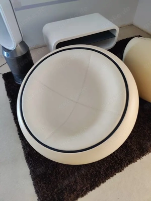 Ich verkaufe zwei stylische Kugelsessel. Die Sessel sind aus Kunststoff, drehbar und mit Kunstleder bezogen. Bis auf die schwarze Akzentuierung (siehe Bilder) ist sowohl die Kugel, als auch die Sitzfläche creme- farbig. Einer der beiden Sessel hat eine ca. 1 EUR- Münzen- große Abnutzung im Kunstleder. ...