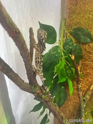 Junge Kragenechse (M) von August '24 abzugeben. Gesund, häutet sich gut. Mit Terrarium (Aufzuchtterrarium aus Vitrine gebaut) 40,- Aufpreis