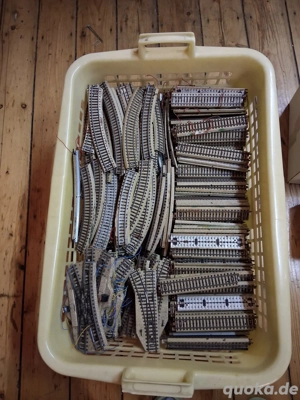 Märkin mit viel zubehör gerade schienen 360st kurven 200st,abzweigweichen mit strom 21 ohne 18 , schienen mit prellbock 13 st.7 cm .schienen zwischenstücke gerate 9cm 39st ,4 cm 60st.halbrund 10 cm ,20st,7 cm gerate 15st ,3 cm 22st ,2 cm 20st .und sonstiges zubehör privat verkauf keine garantie oder ...