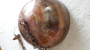 Deckenhängelampe aus Kupfer, Durchmesser 44,5 cm, Höhe 22 cm, mit Kettenbefestigung, keine Beschädigungen , keine Kratzer, mit Glühbirnen, wie abgebildet,