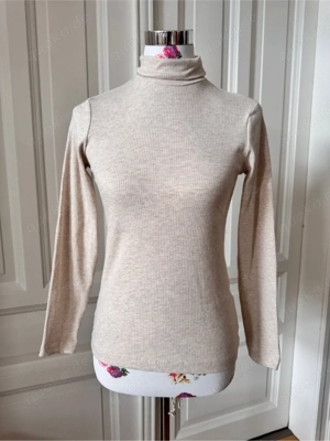 Beiger Rollkragenpullover von H&M Basics, eher dünn, gerippt, eng anliegend. Die Schneiderpuppe hat 36. Die Größe im Pulli ist mit S angegeben. Er ist angenehm weich. Waschbar bei bis zu 30 Grad. 61 % Polyester, 34 % Viskose, 5 % Elasthan. Der Pulli stammt aus einem ehemaligen Raucherhaushalt; ich verkaufe ...