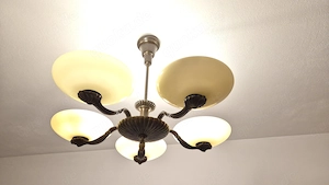 Kronleuchter Hängeleuchte Deckenlampe antik vintage Gestell Metall bronze 5 Lampenschirme Glas, gelbton, einer davon hat einen Sprung, welcher im montierten Zustand von unten kaum sichtbar ist. Weitere 5 (+1 Reserve) Lampenschirme in alternativem Design gehören ebenfalls dazu, Glas creme mit grauem ...