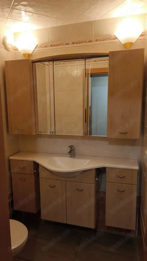 WC Möbel - Set Badmöbel in Beige mit 2x Handtuchhaltern Waschplatz mit viel Ablagefläche und Stauraum ca. 140cm breit und in der Mitte Tiefe ist 50cm, Tiefe- Seitlich ist 26cm, Höhe ca. 65cm (hängend mit dem Waschbecken). Waschtischrank B 60cm, untere Hängeschränke B 30cm. 2x Hängeschränke: Breite ...