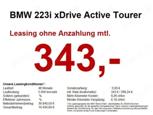 BMW 223 i xDrive Active Tourer M Sport HUD.AHK.PANO.AUSRÜSTUNG: DAB-Radio,Tagfahrlicht,Klimaanlage,Radio,Lederlenkrad,Schlüssellose Zentralverriegelung,ESP,Isofix,Spurhalteassistent,Anhängerkupplung,Kopfairbag,Musikstreaming integriert,Elektrische Seitenspiegel,Apple CarPlay,Sportfahrwerk,ABS,Sportsitze,Volldigitales ...