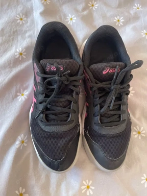 Asics-Schuhe für das Volleyballspiel. - Modernes Design in Schwarz mit rosa Akzenten. - Schnürverschluss. - Sohle mit guter Haftung. - Nur ein kleiner Mangel.