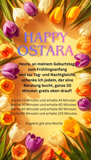 HAPPY OSTARA! Heute, an meinem Geburtstag, zum Frühlingsanfang und zur Tagundnachtgleiche, schenke ich jedem, der eine Beratung bei mir bucht, ganze 30 Minuten gratis obendrauf! Buche 15 Minuten und erhalte 45 Minuten für nur 15 Euro. Buche 30 Minuten und erhalte 60 Minuten für nur 35 Euro. Buche ...