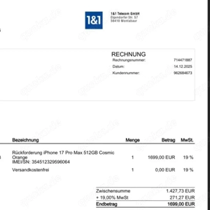 Ich verkaufe ein iPhone 17 Pro Max mit 512 GB in Tiefblau. Originalverpackung und Zubehör sind vorhanden. Das Gerät ist in exzellentem Zustand, ohne Gebrauchsspuren oder Kratzer. Eine Rechnung wird mitgeliefert. Kein Versand. Zahlung per PayPal wird nicht akzeptiert. Nur Abholung. Barzahlung b ...