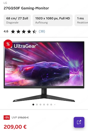 Verkaufe meinen Gaming Monitor von LG, Modell 27GQ50F. Der Monitor funktioniert einwandfrei und wurde nur wenig benutzt. Perfekt für Gaming (z.B. Fortnite, Warzone, FIFA) dank 165 Hz und 1 ms Reaktionszeit läuft super flüssig ohne Ruckler. Details: 27 Zoll (68 cm) Full HD (1920x1080) 165 ...