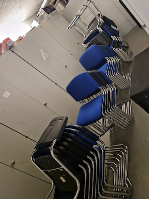 40 stapelbare Konferenzstühle, gepolstert in der Farbe Blau und Dunkelblau, siehe Fotos, fast wie neu für Selbstabholer. Preis VHB je nach Abnahme-Menge, Anzahl.