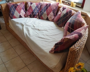 Ein weiteres Sofa steht zum Verkauf an:dieses Mal in grün- beige gestreift, Länge ca. 200 cm, Sitzfläche ca. 80 cm, Durch Umlegen des Rückenteils wird es zum Schlafsofa, oder auch als Bett, dank Federkern, geeignet : Liegefläche ca. 160 breit. Mit 4 Kissen, davon sind 2 als Armlehnen gedacht und 2 zu ...