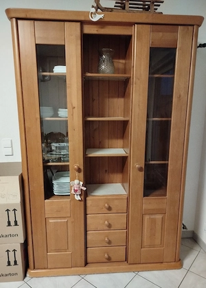 Verkaufe einen Erle Vollholzschrank mit den Maßen 200x136x38 cm mit 4 Schubladen und Regalböden teils aus Glas und Holz. Fußleiste vom Staubsauger verschrammt kann man aber gut reparieren da Vollholz. Dazu gibt es noch einen passenden Tisch und Stühle im separaten Inserat. Design Rainer Daumiller Nur ...
