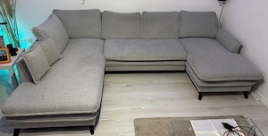 Verkaufe mein graues U-Sofa mit praktischen Schlaffunktiom. Das Sofa bietet viel Platz und ist perfekt für gemütliche Abende oder Übernachtungsgäste geeignet. Großzügige U-Form Integrierte Bettfunktion zum Ausziehen Stauraum unter der Sitzfläche Hellgraue Polsterung Schwarze Holzfüße Die ...