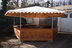 Stabiler Ausschank- und Verkaufsstand - Einzelanfertigung - 6-eckig mit Verkaufstheke und im Innenbereich runder Vollholztischplatte auf separatem Grundgestell mit 1,7 m Durchmesser Kantenlänge 2,6 m Das Dach besteht aus stabiler Lkw Plane und ist ohne Mittelstütze - dadurch viel Stellmöglichkeiten ...