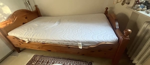 Weichholzbett, 1 x 2 m, mit Matratze (guter Zustand), Lattenrost - oben und unten verstellbar, eine Latte des Rosts angebrochen, beeinträchtigt die Funktion aber nicht gegen Abholung, keine Gewährleistung