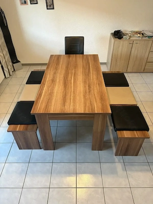 Verkaufe unser Esszimmer welches folgenden Umfang enthält: 1x Esstisch 1,6m lang, 0,9m breit und 0,77m hoch 2x Bank 1,6m lang, 0,37m breit und 0,46m hoch 6x Sitzauflagen für die Bänke 1x Schwingstuhl